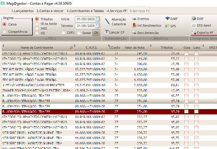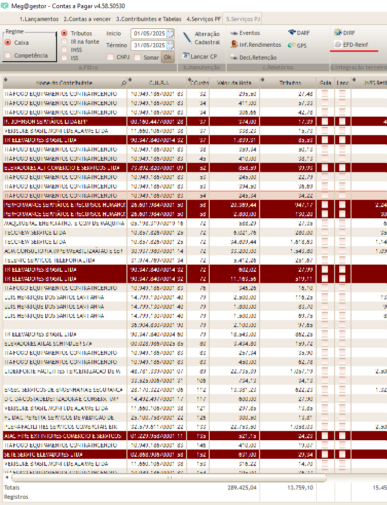 A ferramenta REINF se encontra em Serviços PJ -> EFD REINF. Ao abrir a janela REINF, a primeira aba corresponde a cadastradas as quais possuem retenção. A segunda aba é direcionada aos eventos, e a terceira aos serviços prestados.