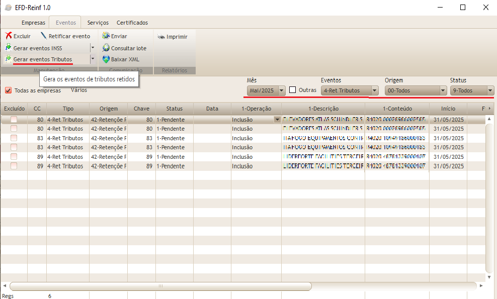 3 - Para listar o(s) evento(s) gerado(s), deve-se aplicar o filtro baseando-se na competência, tipo de retenção ( tributos ou INSS) e status do evento ( pendente, enviado, recusado...).