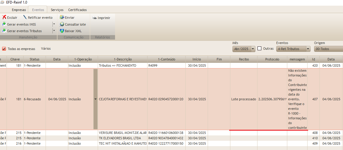 5 - Para consultar o retorno do evento enviado, selecione a opção de consultar lote. Caso o evento seja recusado, uma mensagem será exibida em sua respectiva coluna atribuída ao evento, informando o motivo da rejeição.